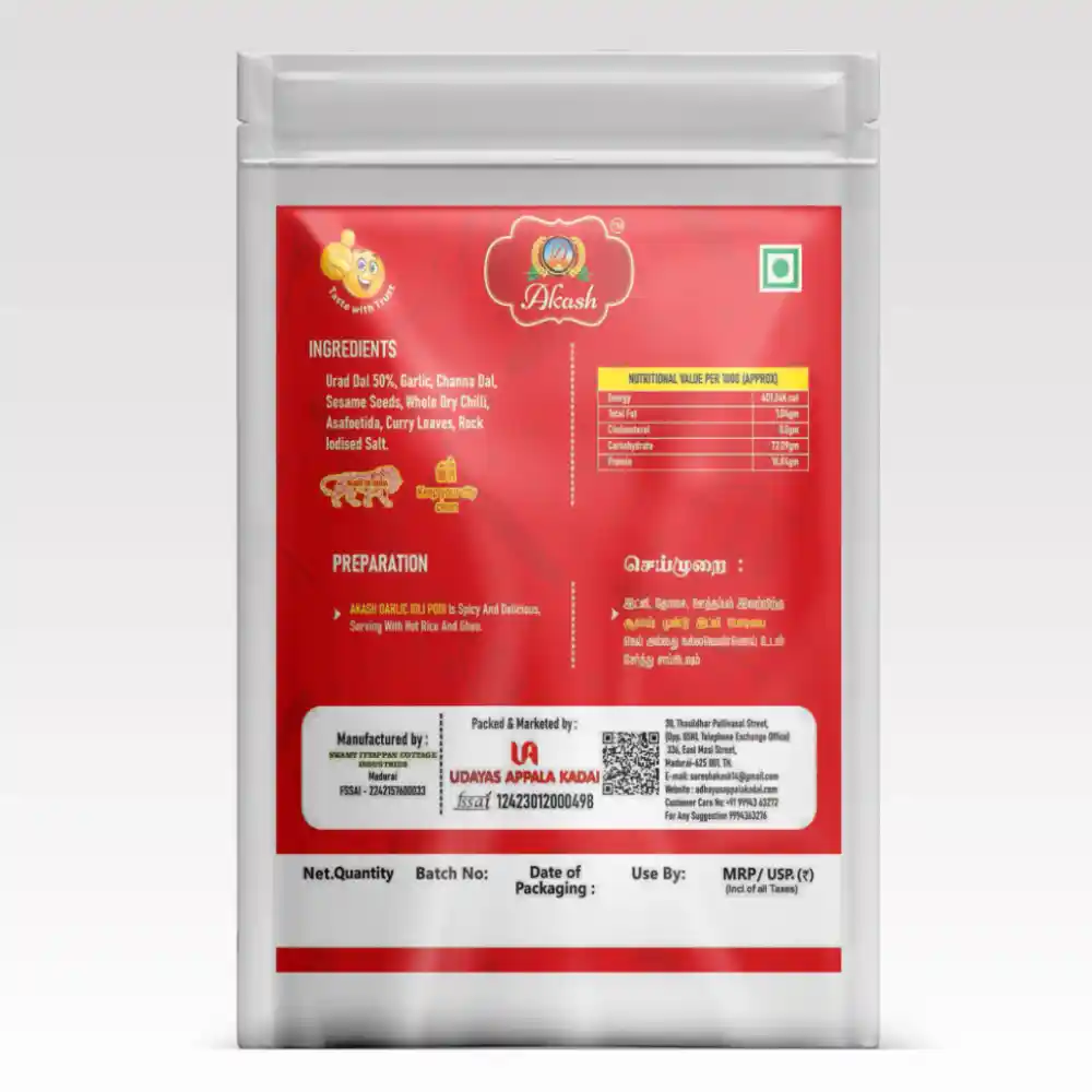 Spl Poondu Idli Podi is a flavourful variation of traditional idli podi made with the addition of garlic. The rich aroma of garlic combined with roasted lentils and spices creates a bold and delicious taste. Mix it with gingelly oil or ghee and enjoy with idli, dosa, or other tiffin items.